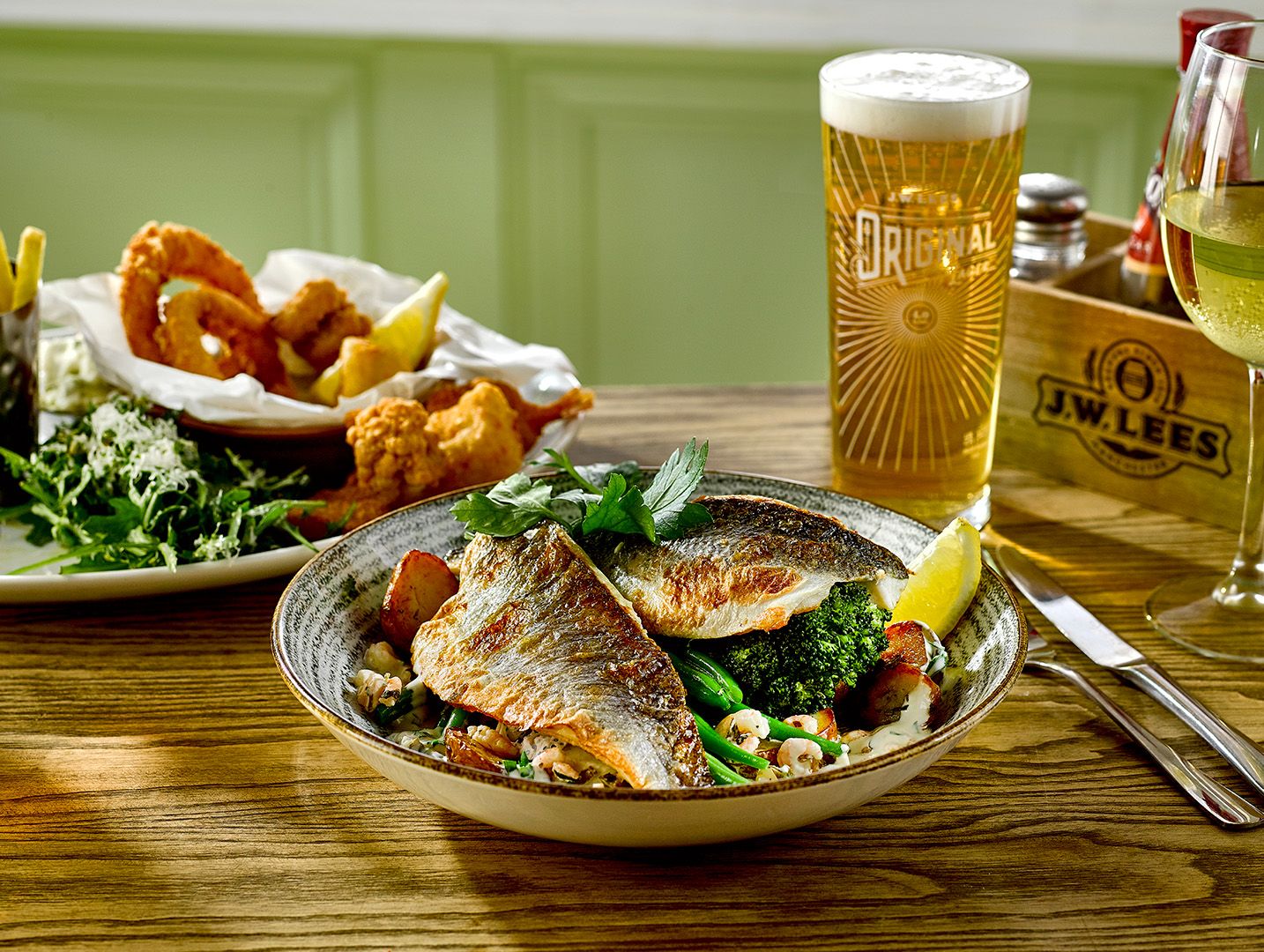 (V) – suitable for vegetarians, (VG) – suitable for vegans, (VGA) – vegan option available, (NGCI) – No Gluten Containing Ingredients, * Can be cooked without gluten. POA = Price On Application. Please ask your server for the price. lf you suffer from a food related allergy please inform a team member for advice before you order. Not all ingredients are listed on the menu & our kitchen uses nuts, gluten and other allergens. Although every care is taken to prevent cross contamination of allergens we cannot guarantee it. Should the listed product be unavailable due to circumstances affecting the supply chain it may be replaced by a similar alternative product. Fish may contain bones. Cooking oil may contain genetically modified ingredients. The calories listed are per serving, additional items to a dish (eg: sauces) are listed separately. Adults require around 2000kcal per day. Weights stated are uncooked and approximate. Prices are GBP. *MPA is our JW Lees Manchester Pale Ale; a golden ale brewed in Manchester entirely from all British malt.
